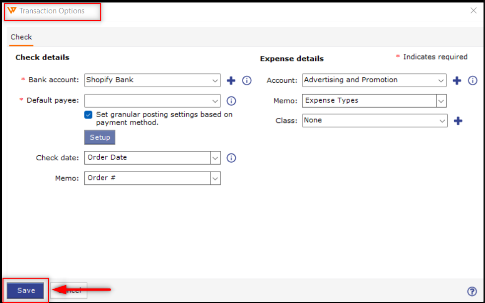 This will get you back to the Transaction Options pop-up window. Click on the Save tab here.