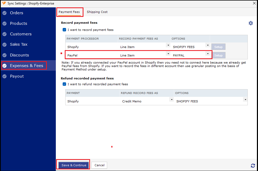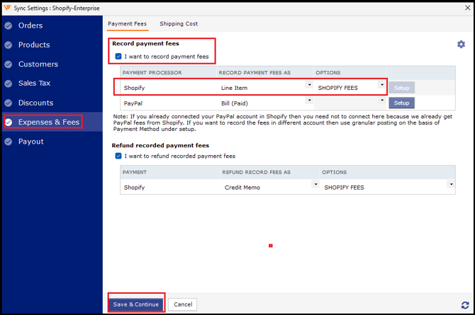 This will enable the option to select the preferred line item for Shopify Payment Fee.