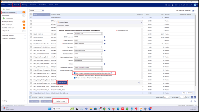 1). In Webgility Desktop, click Products > Missing in QuickBooks> Product Presets, Check the box for “Get group product quantity as individual product quantity” and Save & Close.