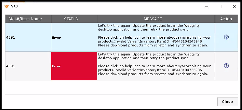 This article provides guidance to Webgility Desktop users on resolving the error “Invalid VariantInventory ItemID – Product Sync Issue” in Webgility Desktop. It explains why the error occurs, typically due to outdated product data not being downloaded from the sales channel before synchronization, and outlines the steps users should follow to refresh product data and successfully sync items between the sales channel and QuickBooks Desktop.
