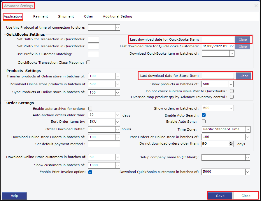 1). In Webgility Desktop, navigate to Connections > Sales Channels > Advance Settings > Application tab> clear the last download date for both Online Store items and Quickbooks items> Save and Close.