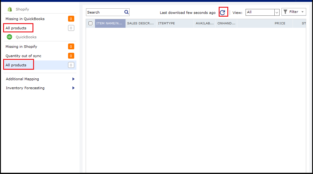 2). Now select Products> All Products for POS/Quickbooks> click on refresh and wait for the process to complete. Once done then go to All Products for the sales channel in this case Shopify> click on refresh and wait for the process to complete.