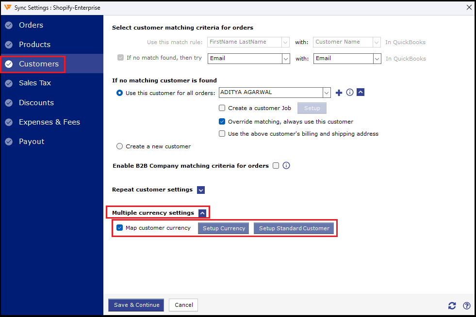 B). Once the data download is complete navigate to Connections > Accounting/POS/ERP > Sync Settings > Customers > Multiple Currency Settings > Map Customer Currency.