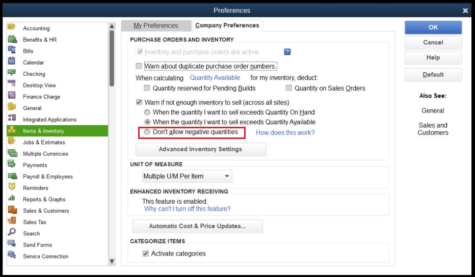 2. Now navigate to Edit > Preferences > Item and Inventory > Company Preferences > Warn if not enough inventory to sell > disable the option “Don’t Allow Negative quantities” and select other available options as per your requirement > OK.