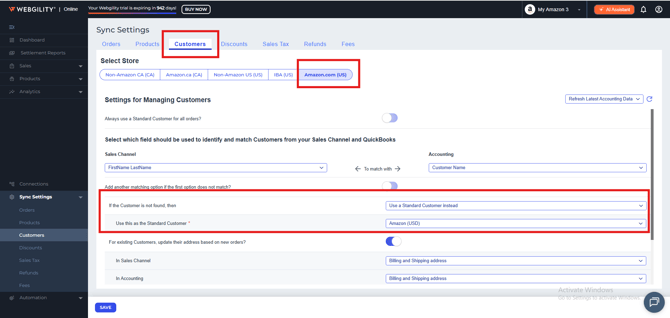 Navigate to Sync Settings> Order and Sync Settings> Customer in Webgility Online.