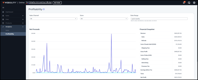 Profitability: This report displays profitability for your entire operation by channel and product across connected sales channels. Webgility syncs revenue and fee data from each connected sales channel and COGs from a connected QuickBooks Online account.