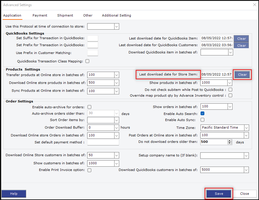2). Under Application, navigate to the Last download date for Store Items, click the Clear button, save the settings, and close.
