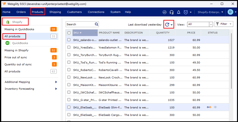 3). Next, you will need to download the latest product data in Webgility Desktop from the product catalog by going to Products > All Products (under the sales channel on the left side) > Refresh button.