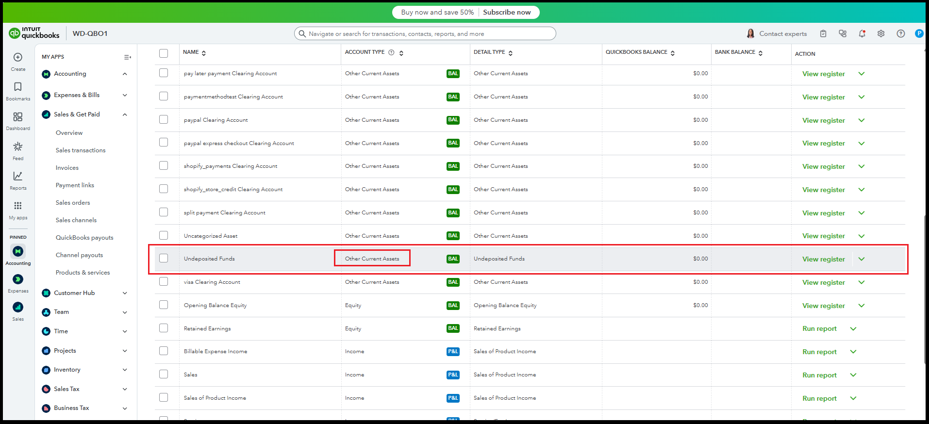 Log in to QuickBooks Online and navigate to the Chart of Accounts.