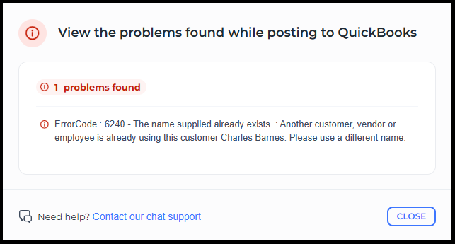 This error typically occurs when there is a customer, vendor, or employee in your QuickBooks company file that shares the same name as the one linked to an order.