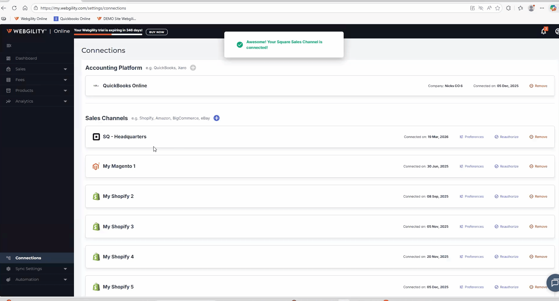 Always verify your active store profiles immediately after every Square reauthorization in your Webgility Online to ensure only the intended locations are connected.