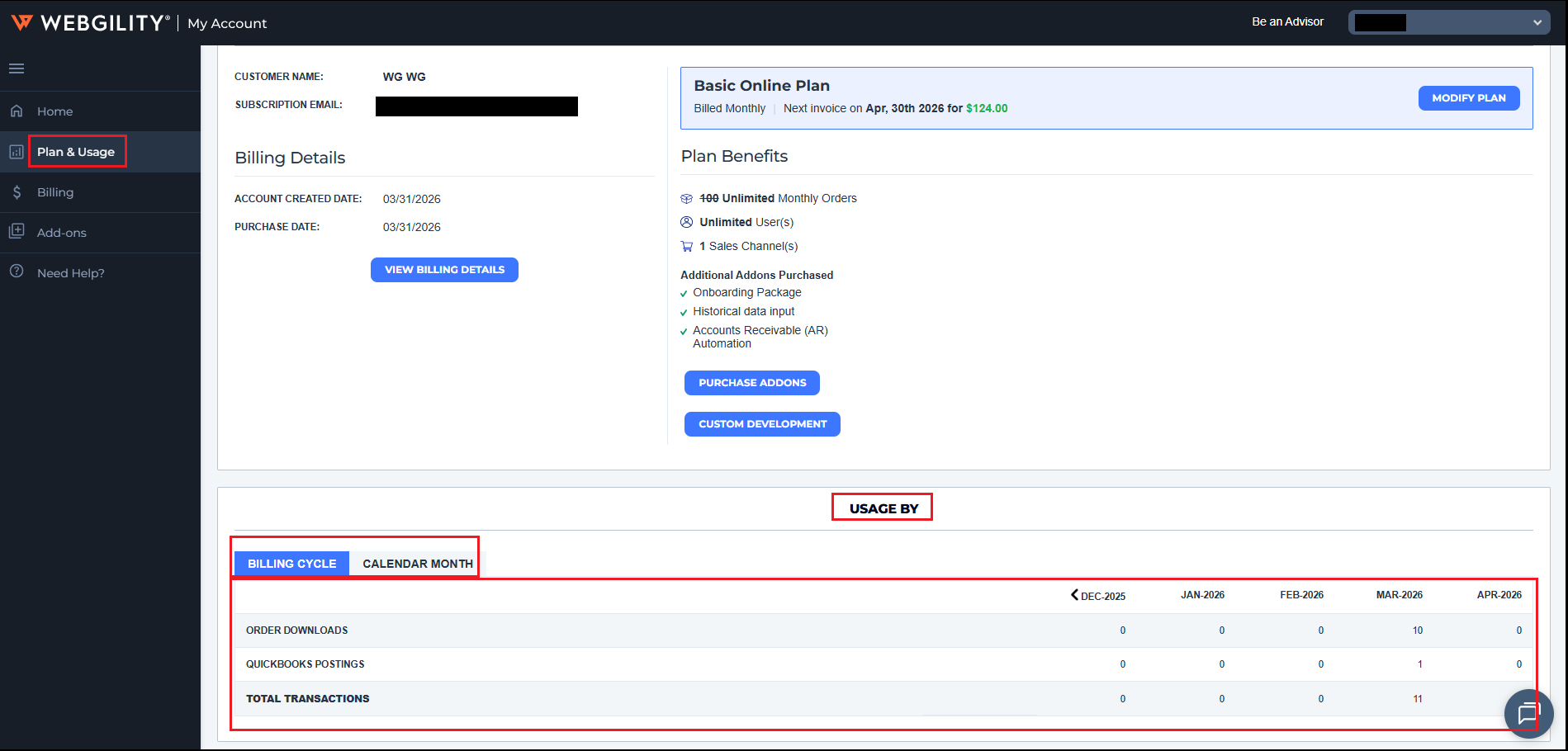 This article provides Webgility Online users with guidance on how to check the number of orders downloaded within their billing cycle. It explains where to find usage details in the Webgility portal and clarifies the difference between viewing orders by calendar month versus billing cycle. The article also directs users to the billing team for further assistance regarding order limits.