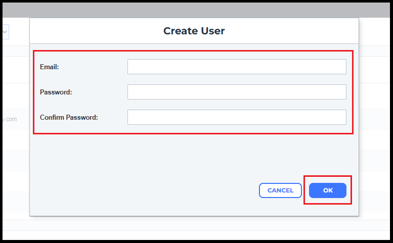 3. Click on Create user and then enter the new user's email address and then password you want to use then click on Save.