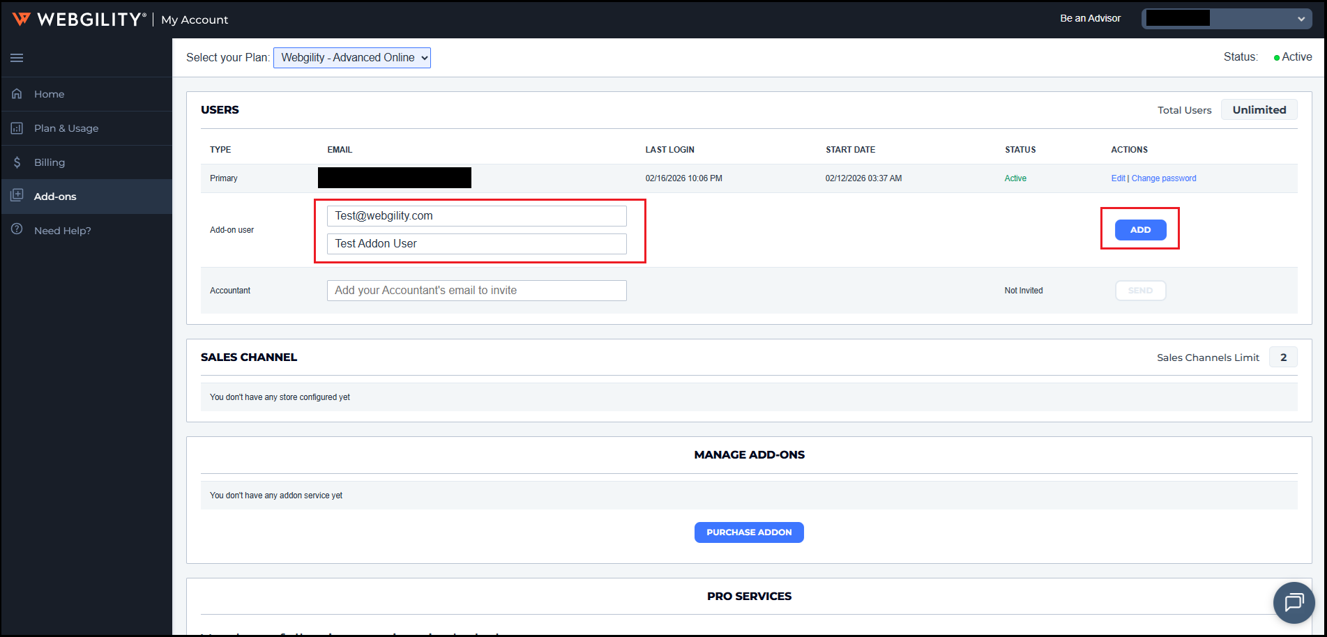 How to Create an addon user for Webgility Online via Webgility Customer Portal account