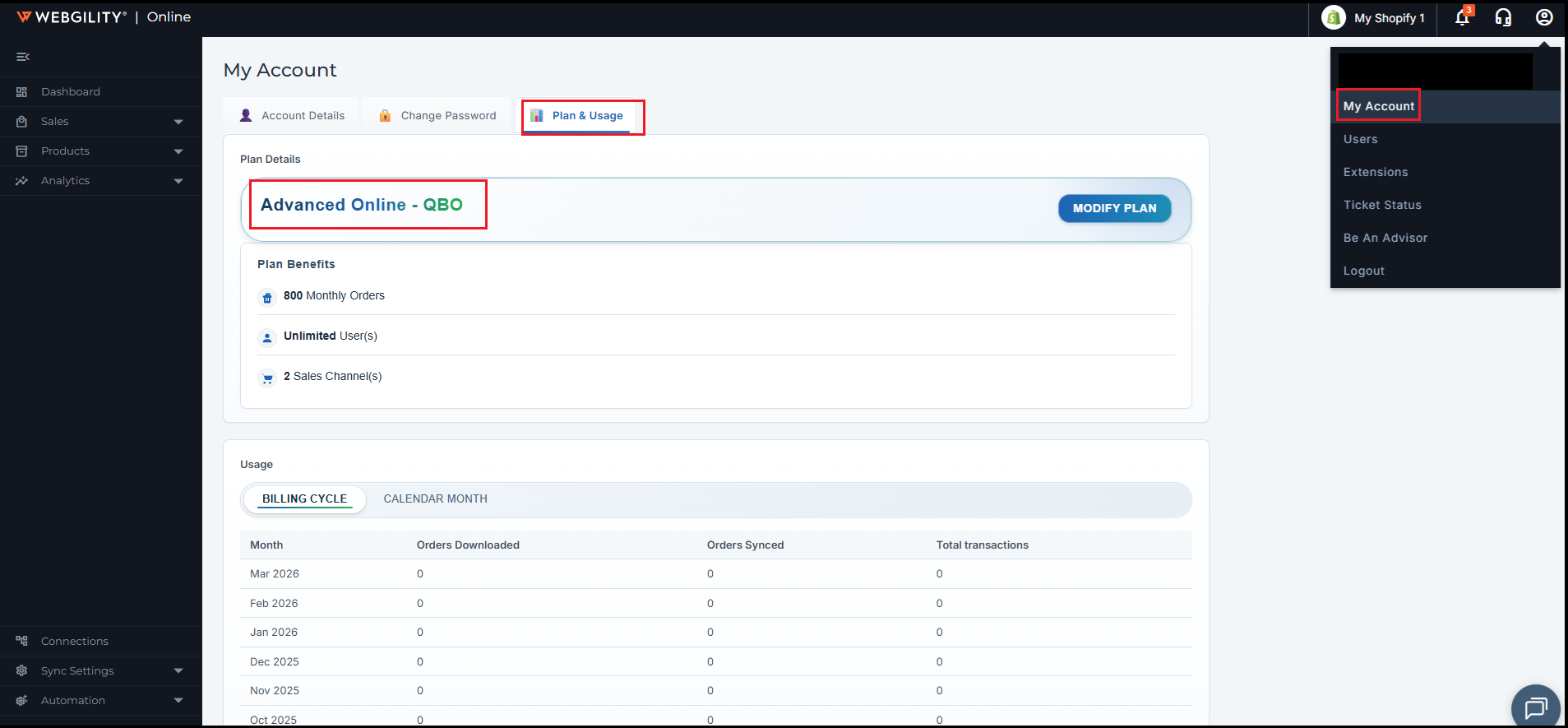 It will open My Account page inside Webgility Online application itself and then you can navigate to Plan & Usage tab where it will show you the current plan you are running for Webgility Online application and it related details.