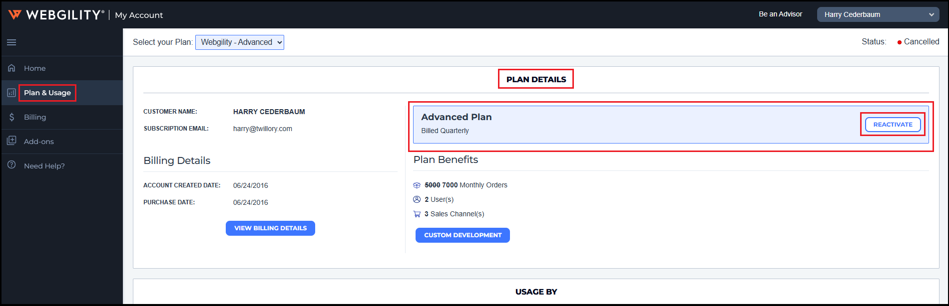 Once you logged in to your Webgility Portal account navigate to Plan & Usage and then click on Reactivate under Plan Details.