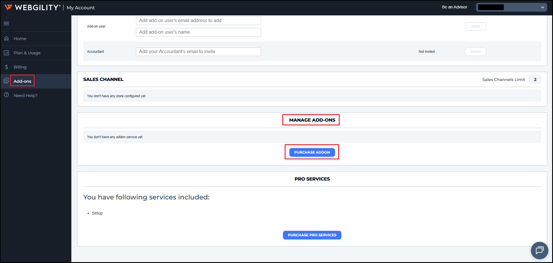 2). Then navigate to Add-ons and under MANAGE ADD-ONS click on PURCHASE ADDON