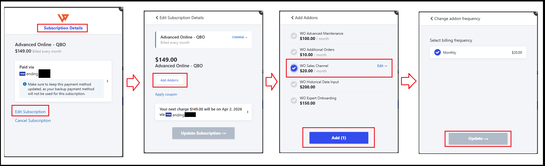 5). Then click on Update and the payment will be processed automatically, and the add-ons will be added to your subscription.