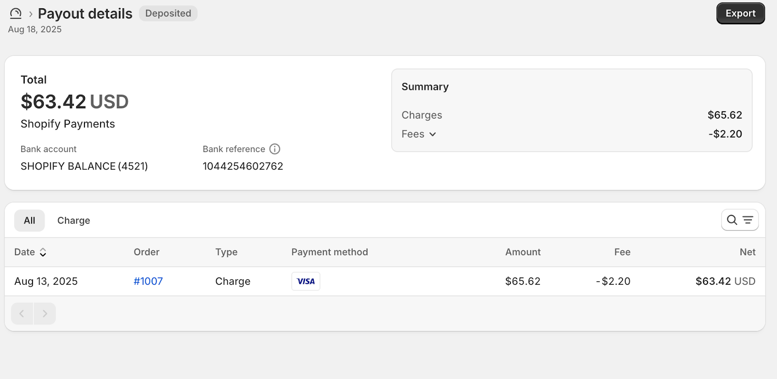 - Find the Shopify Deposit: Locate the deposit from Shopify. Its amount should exactly match the Net payout amount from your Shopify report.