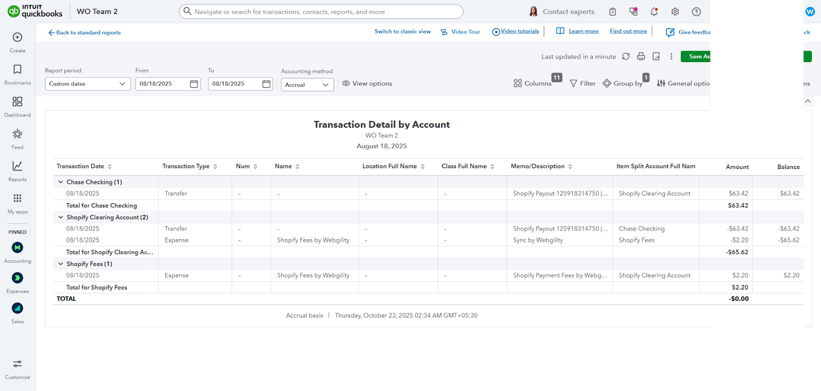 - Check the Expenses (Shopify Fees): Shopify fees are a business expense. In QuickBooks, you can see these recorded in an expense account like "Shopify Fees" by running a Transaction Detail by Account report for that account.
