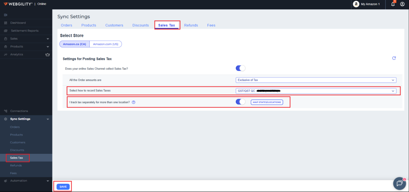 - In Webgility Online navigate to Sync Settings > Sales Tax.