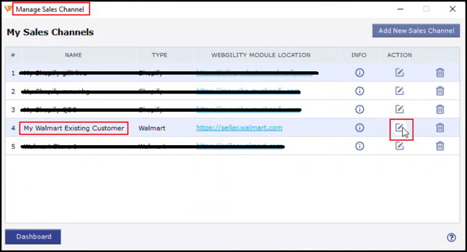 - This will open the list of all the sales channel you have connected, so click on ‘Edit’ button under the Action column for your Walmart channel.