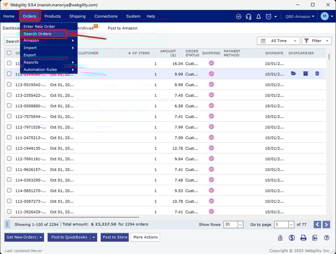 Click on Orders in the main menu, then select Search Orders from the dropdown.