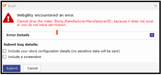 The error "Can not drop the index 'Store_Manufacturer.ManufacturerID'" typically arises during an attempt to update Webgility Desktop. This issue often occurs when logging in after Webgility Desktop upgrade, as the database update process fails to complete properly. To resolve this error, you need to run the DBUtility and DBUpgrade tools. These tools help optimize the Webgility database, resolve errors, and improve performance.