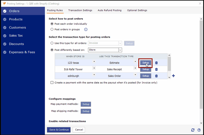 6. Configure the other settings of Posting Rules, Transaction Settings, and Optional Settings. Once configured, click "Save & Continue" at the bottom to proceed to the Product setup.