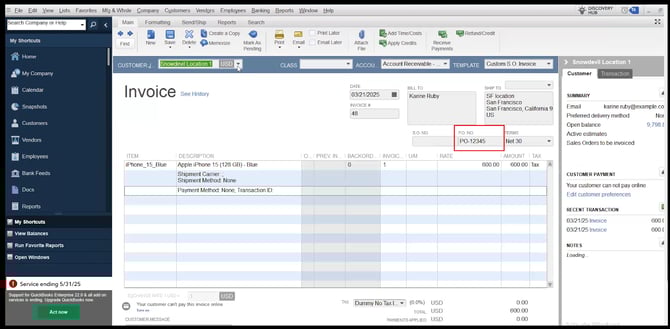Once your order is posted to QuickBooks Desktop, you’ll see the Purchase Order # listed in the QuickBooks Invoice.