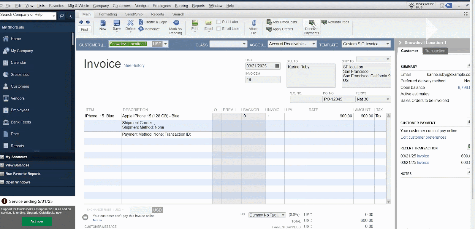 Note: The order must be fully paid in QuickBooks for the payment status to update in Shopify.