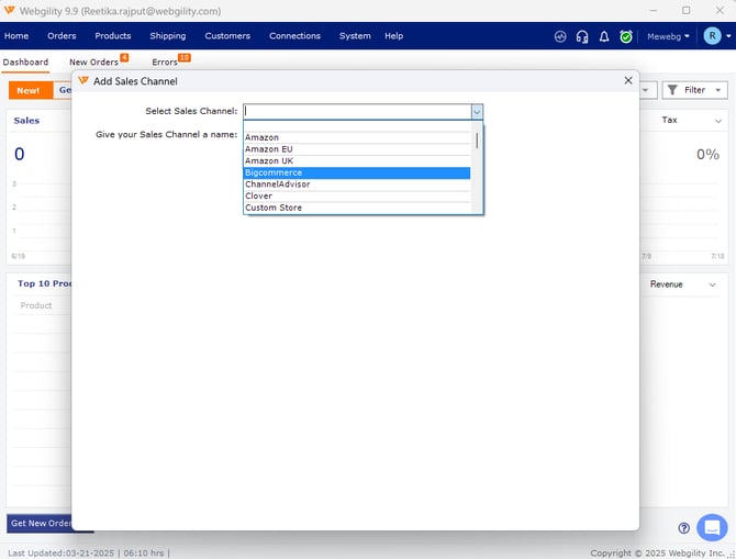 No updates are needed in the "Select the type of Sales Channel" field, as BigCommerce is already connected.