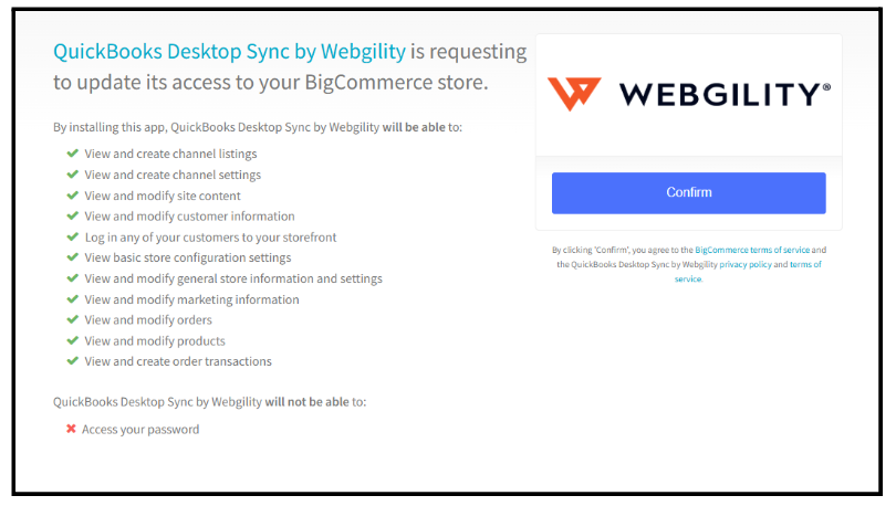 You may need to approve the connection with BigCommerce through two-factor authentication. Once complete, Confirm the connection and Webgility will connect to your BigCommerce store.