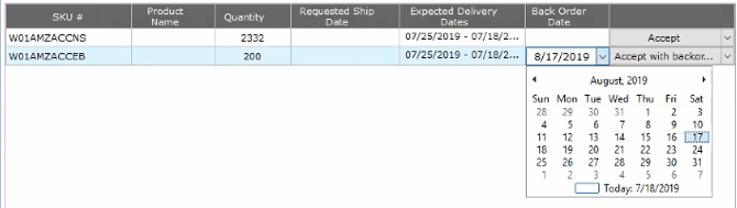 Accept with Back Order - This is Amazon Vendor Central only and when selected will display a calendar to select a date the item is expected to be back in stock.