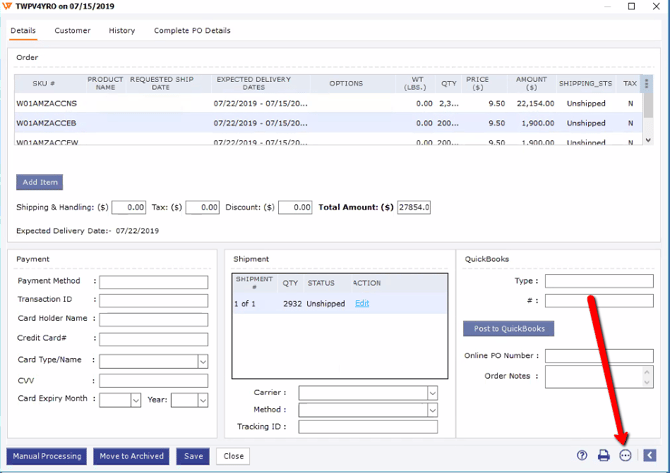 The acknowledge order icon is the three ellipses in the lower right corner of the screen. Clicking this brings up the Acknowledge Processing Order screen.