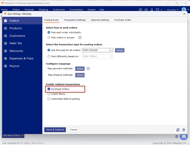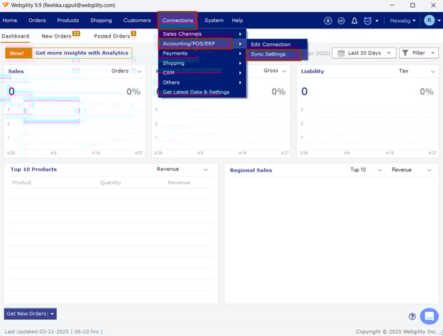 1. The setting you need to adjust in Webgility Desktop can be found within the posting settings. To access it, navigate to Connections, click on Accounting/POS/ERP and go to Sync Settings.