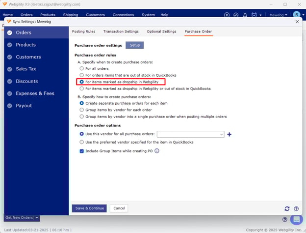 3. Choose the option for products designated as dropship within Webgility Desktop.