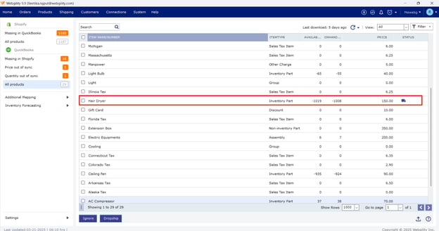 4. To flag specific items as dropship within the Webgility Desktop inventory module, navigate to Products and select QuickBooks All Products. Once there, select the item or items you want to mark for dropshipping, and then click the dropship button located at the bottom left of the screen. After completing this action, a truck icon will be displayed next to the selected item or items.