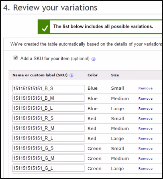 7. eBay will build your variation combination based on the variation set, or details and attributes.