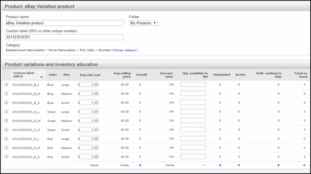 8. After the variation has been created, you can now assign a quantity to each in eBay. Each variation will have a custom SKU and can be changed at any time.
