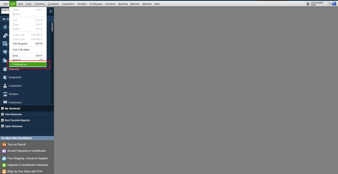 1. Open QuickBooks Enterprise. Go to the Edit menu and select Preferences.