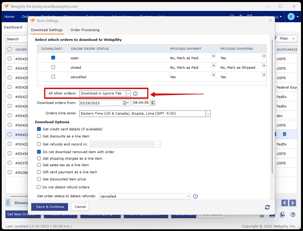 - The orders move to the Ignored tab if the order status is not the one that is selected to be downloaded, and we redownload the order.