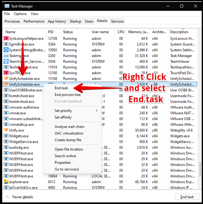 - Look for UnifyScheduler.exe, so select by highlighting it, right mouse click and then end task. Make sure to close all the instances for the same.