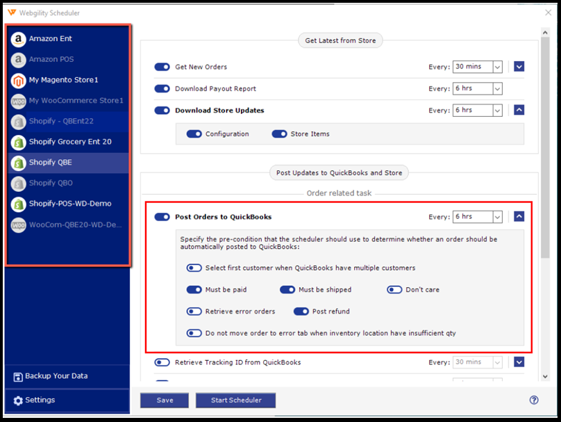 2). If a precondition is selected in the Scheduler for posting an order, for example, it must be marked paid or shipped before posting to QuickBooks Desktop. Then make sure the same status should be present on the required order as well otherwise it will not be picked up by the automation cycle.