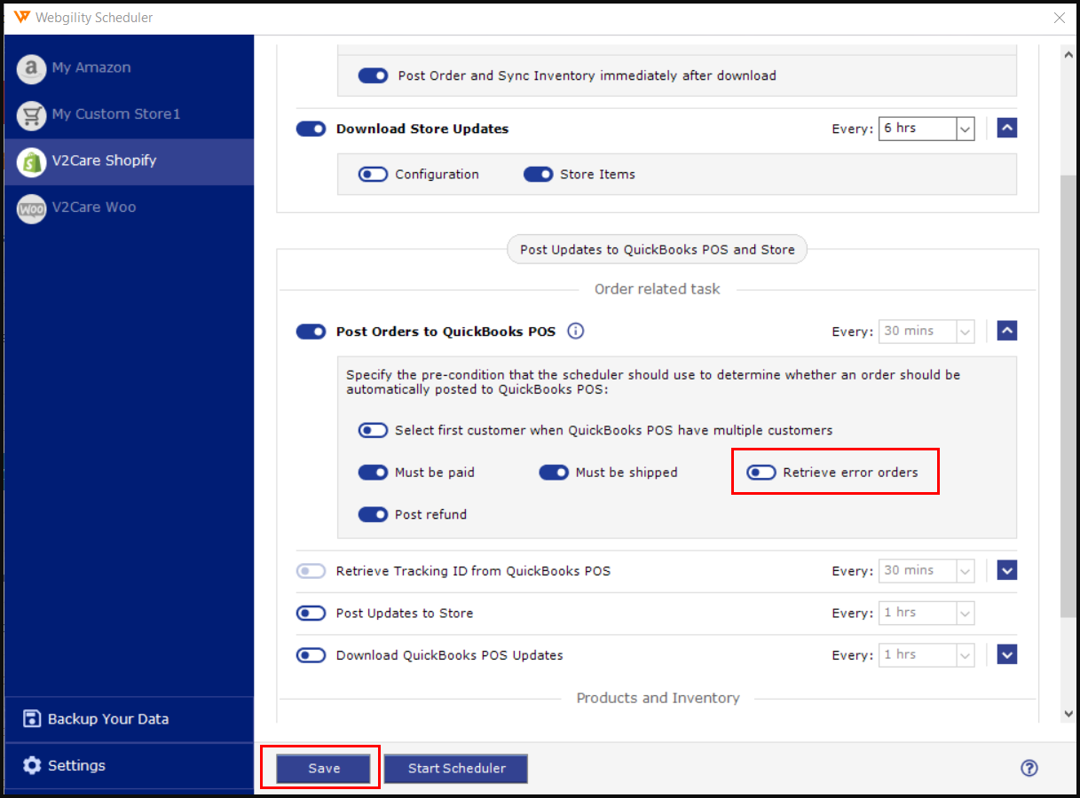 5). In the scheduler settings, enable the "Retrieve Error Orders" option under the required sales channel profile to fetch orders from the Error tab. If an order transitions from the Scheduled tab to the Error tab, it indicates an issue with the order that requires resolution. Once the error is addressed, the Scheduler will proceed to post that order into QuickBooks Desktop.