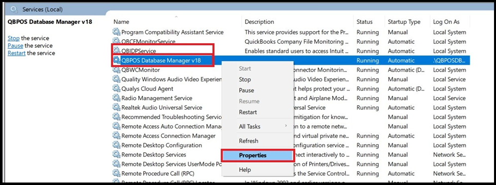 - Next, find QBPOS Database Manager, the version will be the same version you are trying to connect to. Please right-click the QBPOS Database Manager and click Properties.