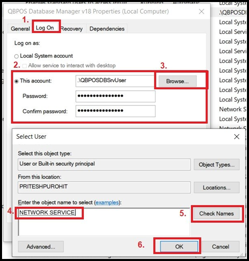 - Next, click the second tab, Log On, and browse the user account. Then input This account information, and the Password, and Confirm the Password. Then click Browse... Next, Enter the object name to select, click Check Names, then click OK.