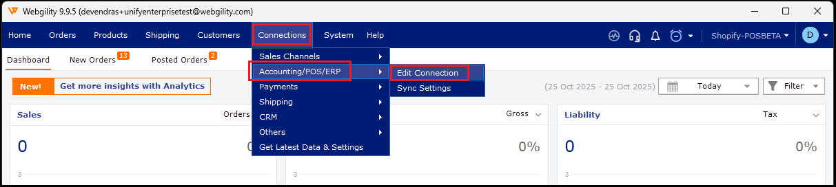 2. After accessing those details, input them into Webgility Desktop by navigating to Connections > Accounting/POS/ERP > Edit Connection.