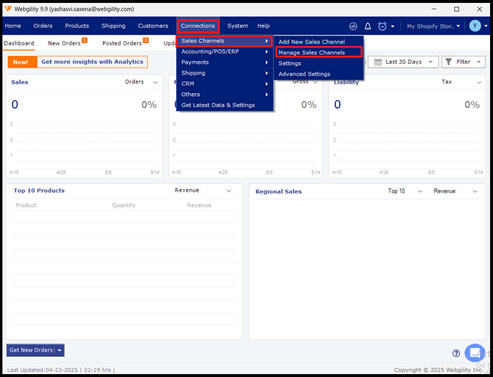 1. In Webgility Desktop, navigate to Connections and then select ‘Sales Channel’ and ‘Manage Sales Channel’