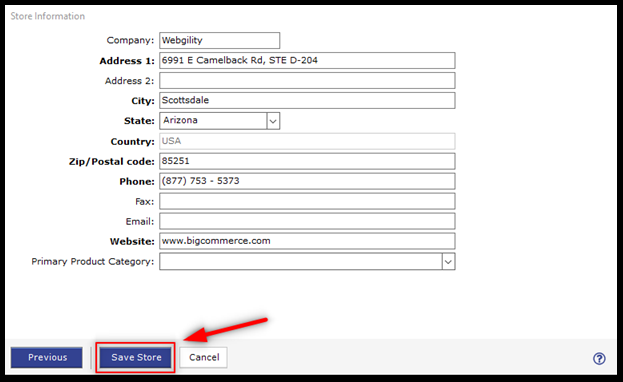 4. Verify your sales channel address and click Save Store. This address will be used as your Ship From and Packing Slip Address.